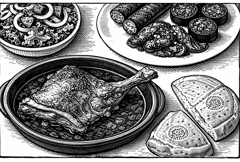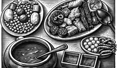 Carrillera de ternera - Pollo de corral - Panceta curada -Oreja - Tocino - Garrón de jamón - Chorizo ahumado de León - Morcilla de Burgos - Terrina de manitas y espinazo